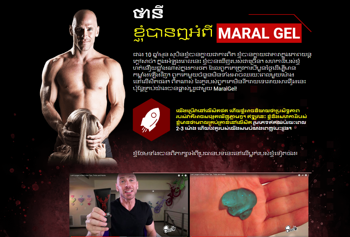 ខ្ញុំតែងតែខិតខំធ្វើការងារដើម្បីធ្វើឲ្យជីវភាពគ្រួសារខ្ញុំកាន់តែប្រសើរ។ តែជាអកុសល ខ្ញុំល្អមិនគ្រប់គ្រាន់សម្រាប់ធ្វើឲ្យប្រពន្ធខ្ញុំពេញចិត្តឡើយ។ យើងរួមភេទតែចុងសប្តាហ៍ ហើយម្តងៗគឺគួរឲ្យធុញទ្រាន់ណាស់ នាងរអ៊ូថានាងគ្មានអារម្មណ៍អីសោះ និងថានាងមិនដែលដល់ចំណុចកំពូលទេ។ មិត្តខ្ញុំបានណែនាំឲ្យខ្ញុំសាកល្បង Maral Gel ។ ខ្ញុំពិតជាភ្ញាក់ផ្អើលនឹងលទ្ធផលណាស់។ ក្រោយពីប្រើបានប្រាំថ្ងៃ ខ្ញុំចាំផ្តើមសង្កេតឃើញថាវាវែងនិងធំជាងមុន យ៉ាងតិចក៏ +4 ស.មដែរ! ឥឡូវខ្ញុំឡើងគ្រែជាមួយប្រពន្ធខ្ញុំរាល់ថ្ងៃ ជួនកាលពេញមួយយប់តែម្តង ហើយនាងសប្បាយចិត្តណាស់! កែវភ្នែករបស់នាងបញ្ចេញរស្មីម្តងទៀតហើយ ខ្ញុំមានអារម្មណ៍ថានាងសកម្មជាងមុន និងក្មេងជាងមុន។ ជីវិតខ្ញុំពិតជាប្រសើរជាងមុនមែន!
